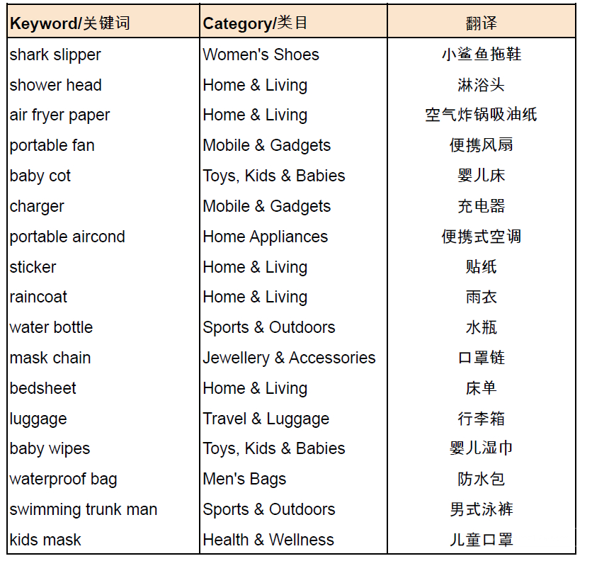 *特别提醒: 在2022年6月13日-2022年7月16日期间,如卖家改价幅度不超过本次佣金调整幅度(1%) ,则不会被判定为“夸大不实折扣”。 2. 新加坡仿冒品整改 新加坡站点会严格对仿冒品进行及时的清理以及整改。没有品牌方授权的卖家不可在产品标题,描述以及品牌属性中滥用品牌名称和商标。例如,近日发现很多无品牌的蓝牙TWS耳机在产品名称中加入AIRPODS等字眼。此类产品一经 查实会被下架,并且店铺会被罚分。另外,没有小米官方授权的店铺和小米生态系统的产品不得滥用小米品牌的名称和商标。恳请各位卖家严格遵守卖家行为规范,需获得品牌方的授权才可使用该品牌的名称或者商标。 二. 关键词&商品分享 1. 虾皮平台热搜关键词( *搜索量排名不分先后)