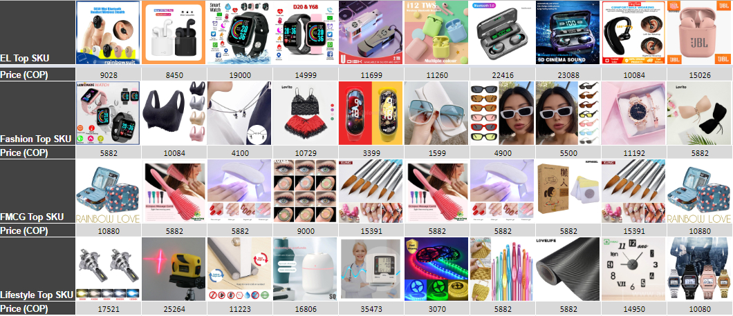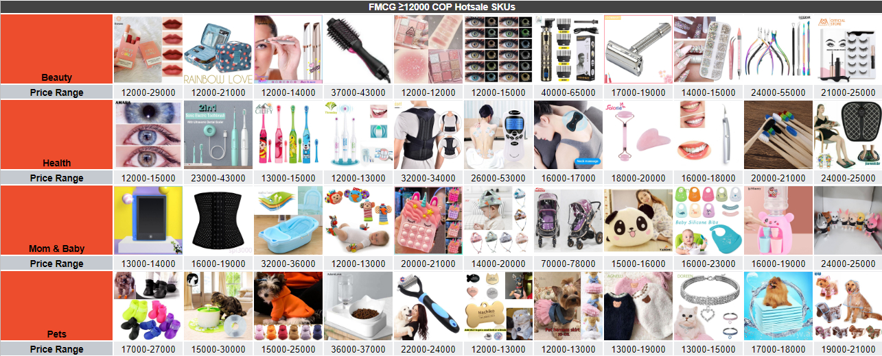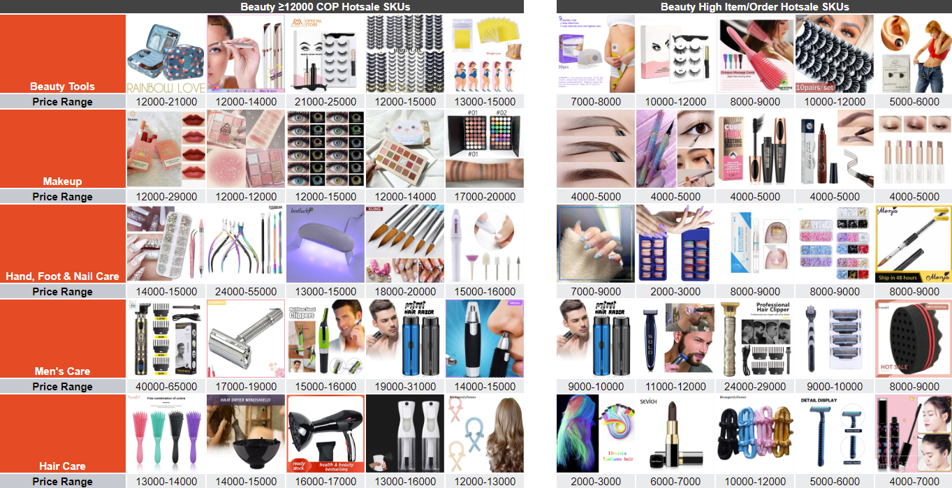 * 以上价格为哥伦比亚比索(COP) 高价热卖品: ● 美妆工具: 化妆收纳包、电动修眉器、假睫毛套装、瘦身产品套装 ● 美妆产品:口红套装、大眼影盘 ● 美甲产品:美甲装饰钻、美甲钳套装、光疗机、美甲刷套装、电动磨甲器 ● 男士护理::电动剃须刀/理发器、鼻毛修剪器 ● 头发护理::梳子、吹风筒替换头、美发喷壶、丝绸卷发器 凑单意愿高的热卖品: ● 美妆工具:减肥磁铁、假睫毛套装(磁力/无磁力)、梳子 ● 美妆产品:眉笔、眼线笔、眼影笔 ● 美甲产品:甲片、美甲装饰钻、单只美甲刷 ● 男士护理:迷你电动剃须刀、理发器、剃须刀替换刀片、卷发海绵 ● 头发护理:多色假发片、丝绸卷发器 * 以上价格为哥伦比亚比索(COP)