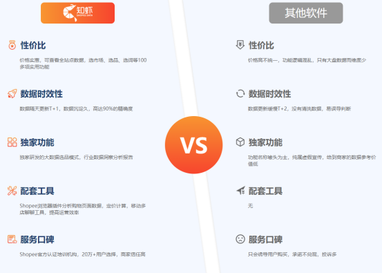 虾皮数据分析工具哪个好?知虾让数据分析变得轻松快捷中国有句俗话说得好:工欲善其事,必先利其器。学会掌握工具是人类和其他动物区分开的关键,这个道理在跨境电商市场照样行得通,现在在做某宝的大大小小的商家哪一个手里没有一两款工具做生意参谋?做shopee虾皮平台是一样的道理,但是由于虾皮的起步时间较短,目前市场上的数据分析工具来来去去就那几款,但知虾数据是其中的佼佼者。 ![]() 篇幅有限,下面主要从分析知虾数据是什么、为什么选择知虾数据以及知虾数据能做什么,三个维度展开,相信看完你对“虾皮数据分析工具哪个好”这个问题心里会有答案。 一、知虾数据是什么?如果你做完某宝,肯定用过生意参谋,没错,知虾数据可以类比为shoppe虾皮的生意参谋。知虾数据是萌啦科技研发的一款Shopee数据分析服务平台,Shopee版跨境生意参谋,可以快速抓取分析马来西亚,新加坡,印度尼西亚,泰国,越南,菲律宾和中国台湾等东南亚市场大数据,帮助商家产品出海打造爆款。 二、为什么选择知虾数据?知虾数据存在的意义,说白了就是为了方便shopee虾皮商家了解自己店铺的日常运营数据以及虾皮市场同行的运营数据。可以分成两个维度来阐述。 ![]() 第1个是虾皮商家必须要学会做数据分析 店铺的日常运营,会产生非常多的数据,比如自己店铺的数据有浏览量、流量数、支付子订单数、支付金额、支付转化率、客单价、退款金额、较上周同期变化率等,外部的数据热销品销量、同类产品数、30天销量,产品热搜词、用户画像等等。学会做数据才能知道店铺现状如何,并结合内外部的数据反馈,不断的做店铺的调整以求店铺达到最佳的状态实现稳定发展。 第2个是知虾数据相较于其他数据工具的优势 ![]() 通过上图可以看出,知虾数据目前在市面上无论是性价比、数据时效性、独家功能、配套工具以及服务口碑,较其他虾皮软件都具有一定的优势,当然,你也试用一下知虾以及其他工具,试通过真实体验一段时间,再做对比。 三、知虾数据能做什么?知虾数据Shopee大数据分析,主要是涵盖了9个站点分析、行业大盘数据、产品分析、店铺分析、飙升商品榜单、标签词热搜词分析、关键词查排名、货源采集、定价计算、浏览器数据插件等功能,帮助卖家轻松掌握Shopee平台动向,发现蓝海商品,为运营决策提供数据支持,驱动业绩持续增长。 ![]() 1入驻阶段 通过站点和行业深入分析掌握类目行业走势及市场需求,精准定位店铺市场方向,抢占商机。 2选品阶段 通过查看产品分析,了解热销产品、飙升产品和热销新品的销售数据成长指数,快速发掘潜力宝贝。 3预售阶段 利用监控中心监控产品和店铺,快速了解竞品和自家产品的销售情况排名,可以及时调整运营方式,提高商品的转化率。 4爆款阶段 查看产品热搜词的数据表现,分析商品的价格走势和营销情况,深入挖掘流量变化,有利于运营调整持续维持转化率。 5强大数据平台 利用店铺对比、产品对比多维度分析商品,包括:产品销量、同类产品数、30天销量,深度分析产品营销信息。 6成熟运营阶段 查看全站的整体GMV和销量走势,深度分析全站市场的发展空间,充分掌握市场变动环境,合理制定最优的运营策略。 |