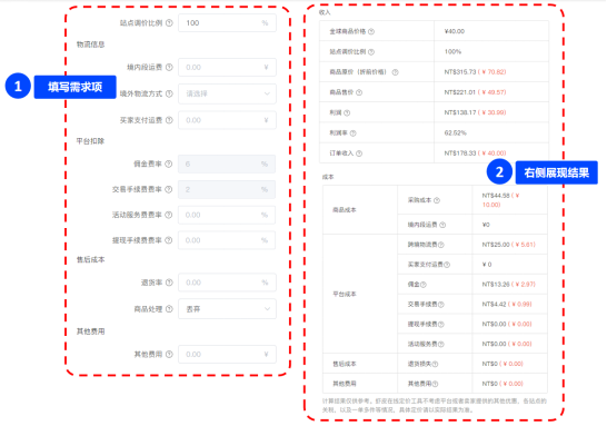 1、首先选择好对应的站点,填写①采购成本、②包裹重量、③商品售价